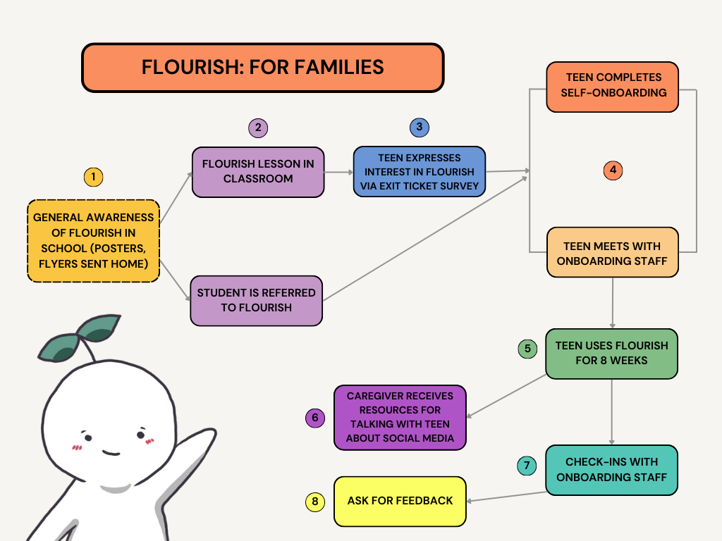 Students may also “self-refer” to Flourish by endorsing interest in the program after participating in a classroom lesson about social media and online interactions if they foresee a benefit in using it based on the same criteria detailed above.